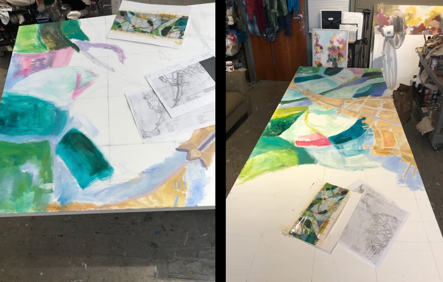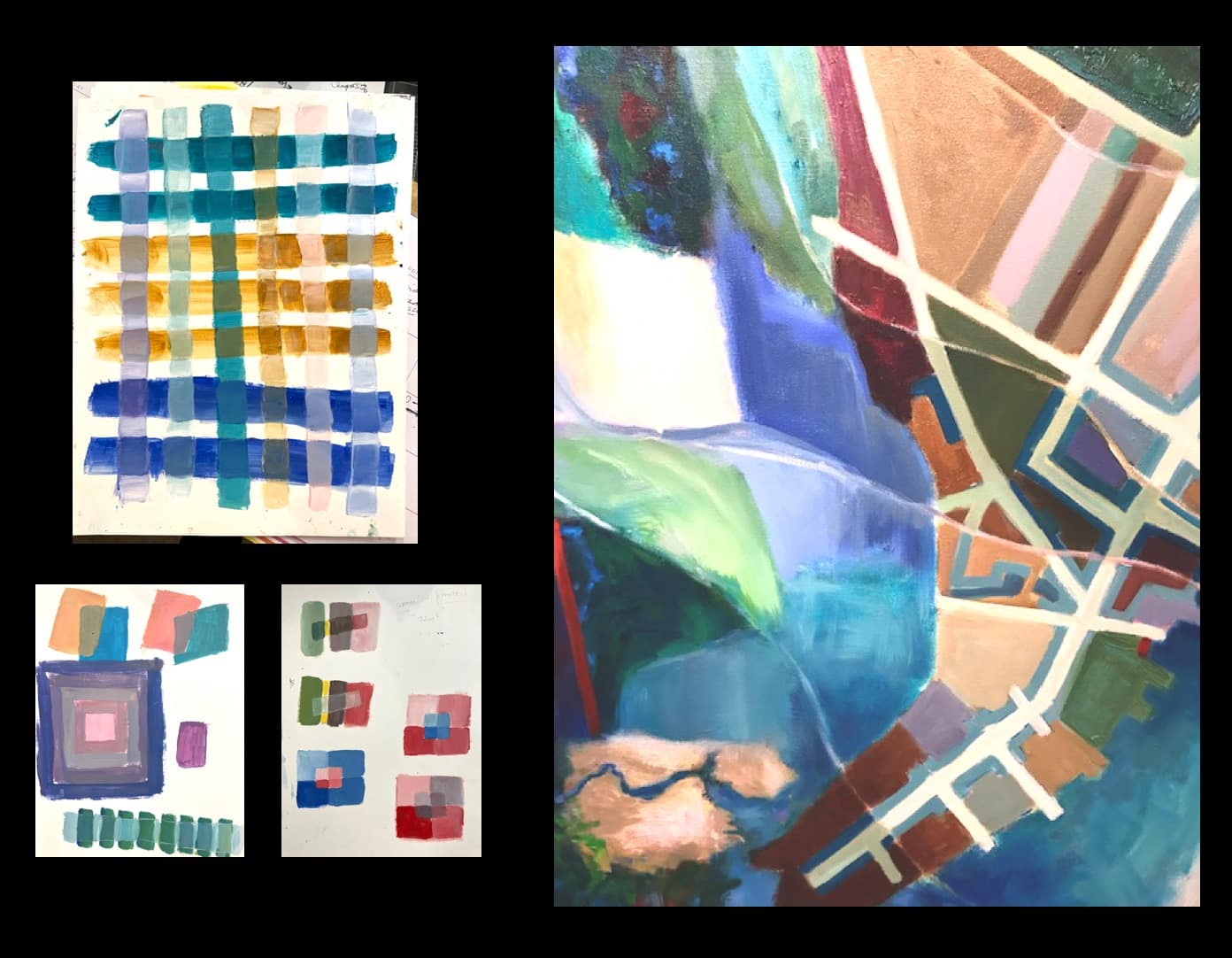 And as we discussed colors in the space with Emily, the whole palette became more subtle and I began to experiment with transparencies. The whole painting was completed in oil colors. All those years of teaching color theory came together as I worked on the large oil painting!
